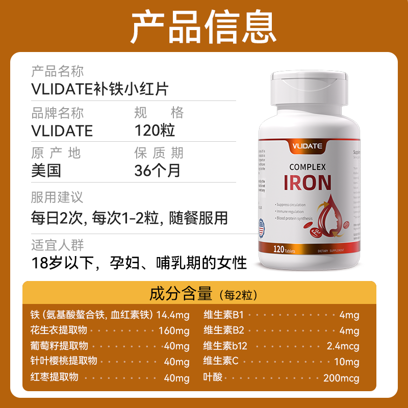 美国VLIDATE维力特 甘氨酸亚铁片 120粒/瓶